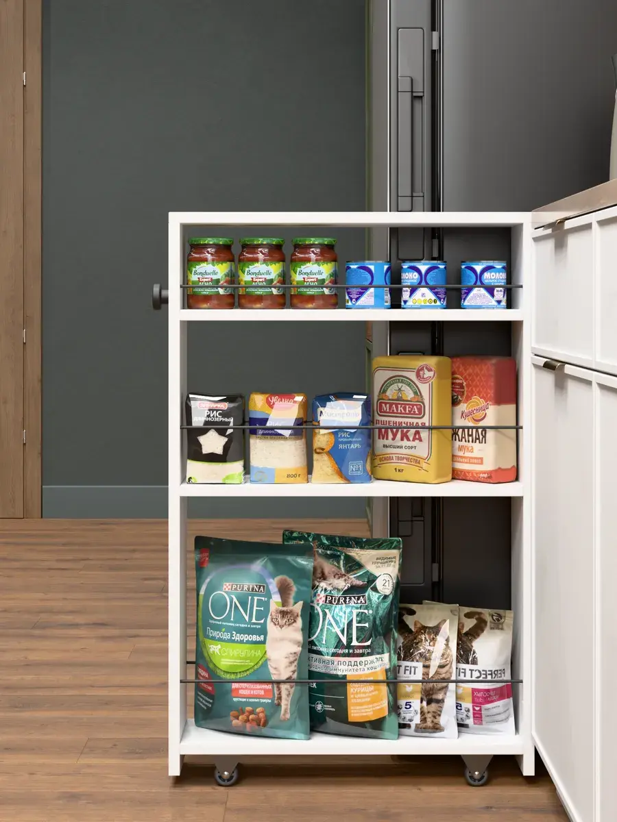 - Многофункциональность: Этажерка оснащена различными полками и ящиками, что позволяет удобно организовать продукты и кухонные принадлежности.